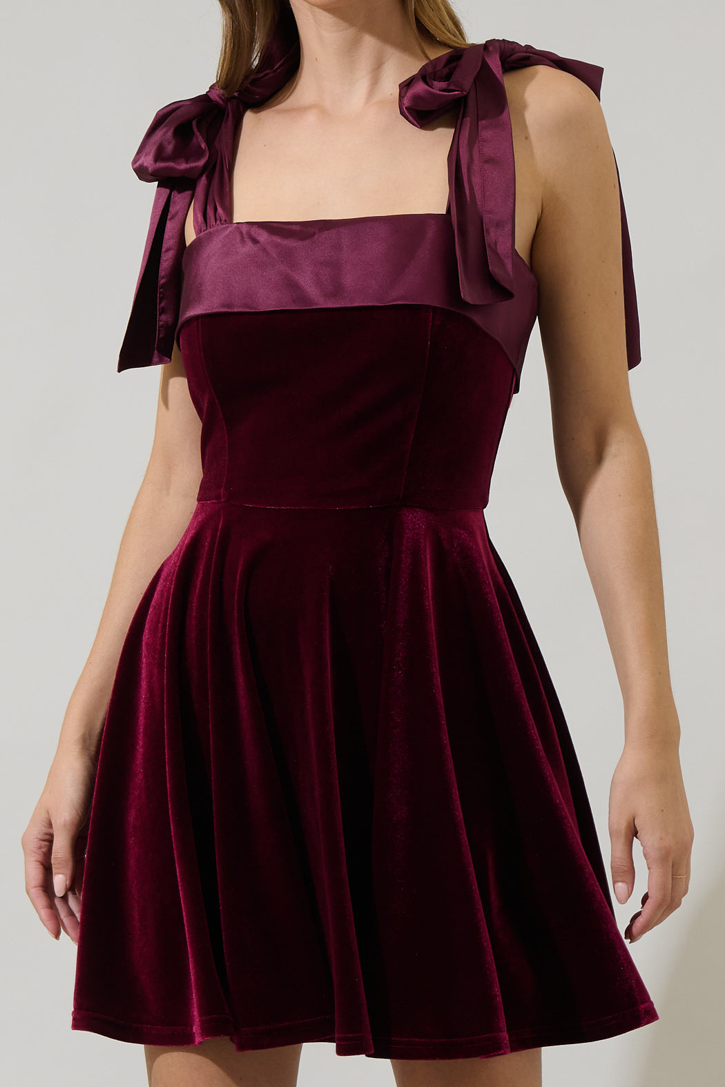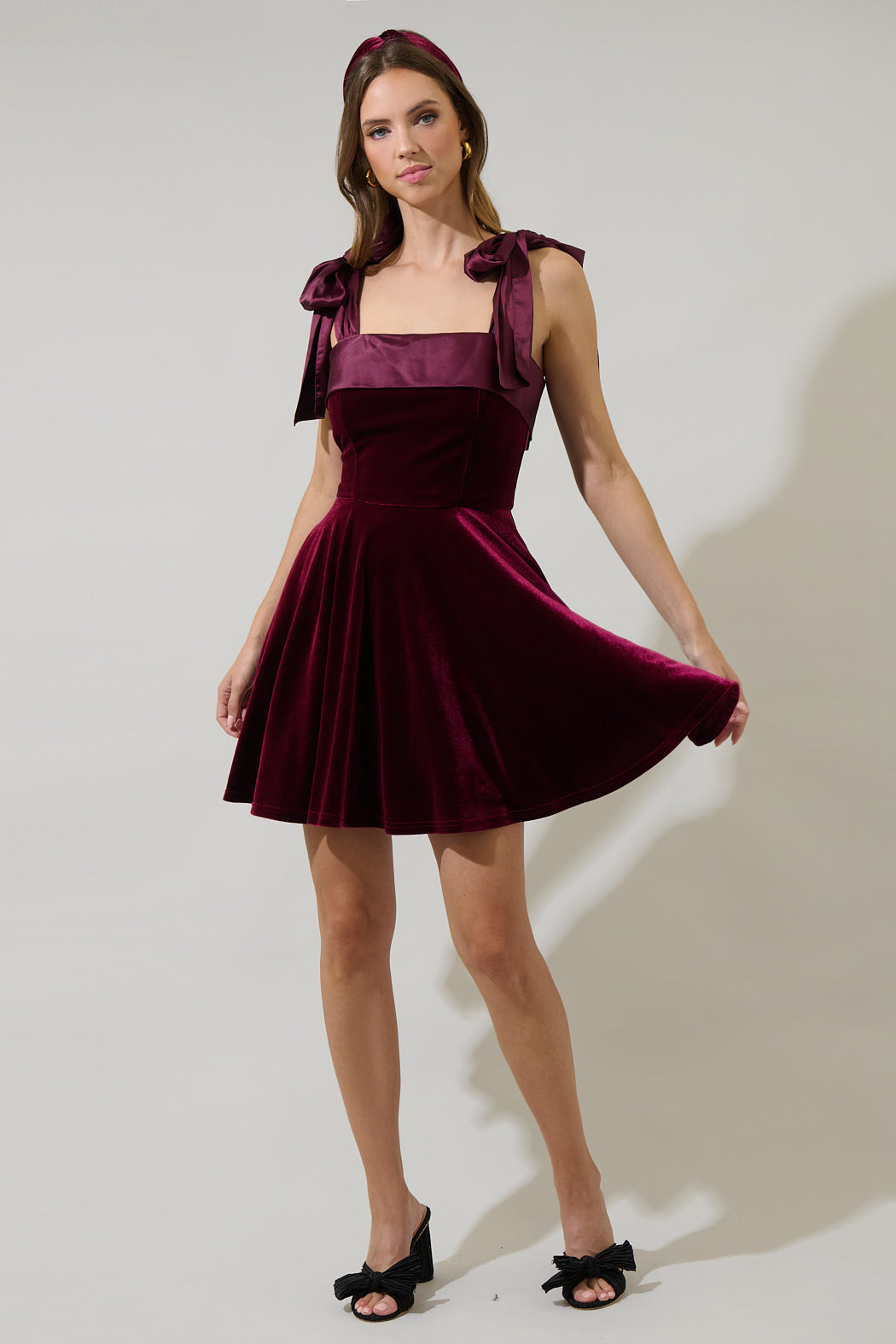 The simplest things can become the prettiest, for example the Adison Bow Flounce Mini Dress. Shoulder tying bows frame a straight neckline in the soft velvet mini dress. Pockets on each side with a sweep flounce skirt give it an extra touch. Pair it with gold or black heels to complete the look.