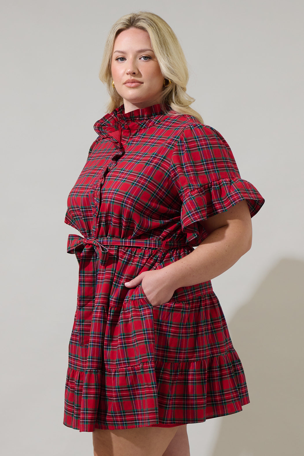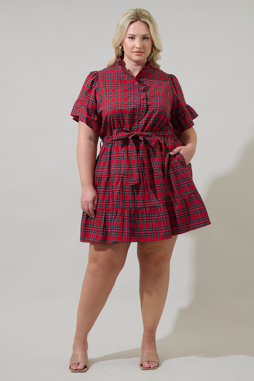 Perfect fall days start with the Arvada Plaid Cottonwood Ruffle Button Down Mini Dress. A red multi plaid pattern shapes this mini dress that has short sleeves, ruffles, belt around the waist, and a functional button placket at the front. Easy to pair with heels or boots.