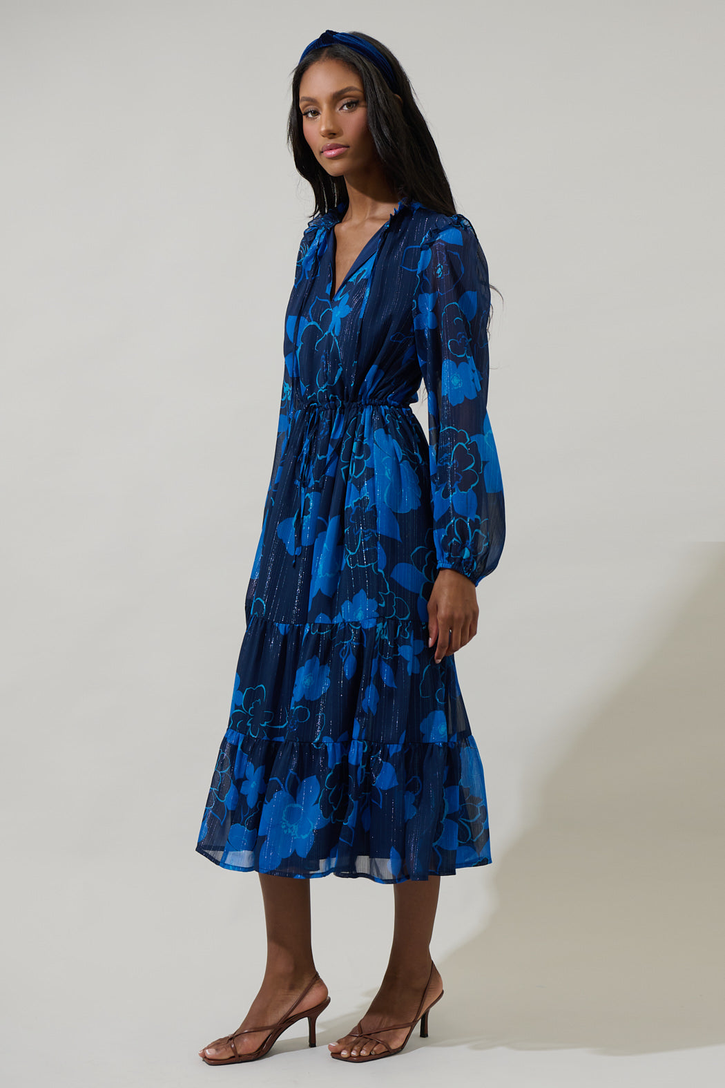 The Bluford Floral puts a stylish spin on a classic Kristen Tiered Midi Dress. It features a ruffle trim split neckline with tie details attached. A sheer ruffle sits at the shoulder seam of long, flowy balloon sleeves that frame a tiered, lined midi skirt. Adjust the waist with a drawstring tie. Pair it with wedges or open toe strappy heels.