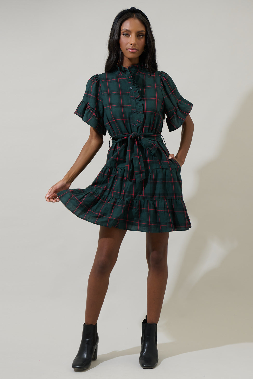 All your fall looks will be elevated this season with the addition of the Brook Plaid Cottonwood Ruffle Button Down Mini Dress. A green multi plaid pattern shapes this mini dress that has short sleeves, ruffles, belt around the waist, and a functional button placket at the front. Easy to pair with heels or boots.
