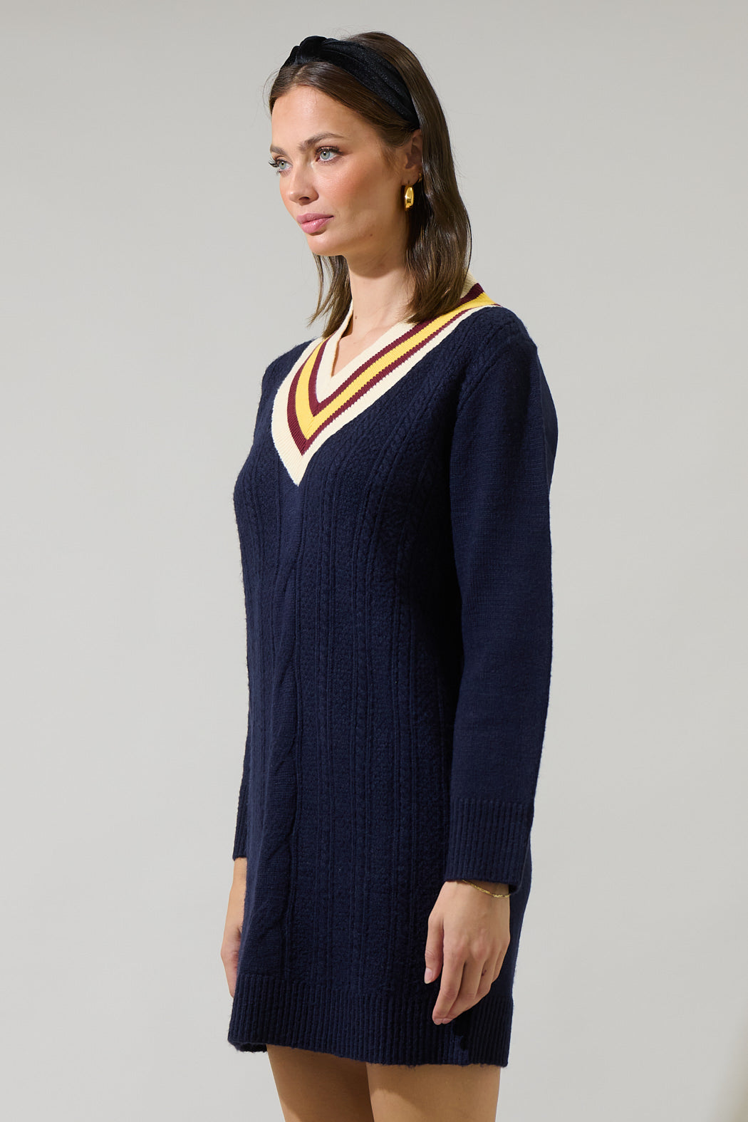 We love to keep cozy in this effortless Corunna V-Neck Mini Sweater Dress. A color block and striped v-neckline frames this long sleeve dress. A cable knit design enchants the middle front. Perfect to wear this cold season with high knee boots.