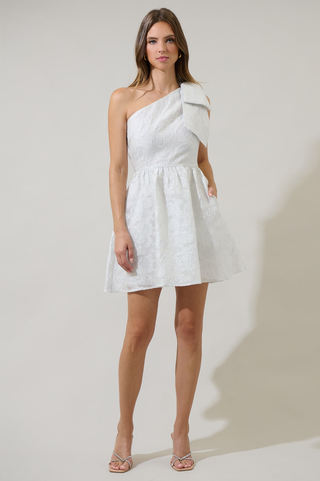 There's no end to our love for the Kanosh Jacquard Ivine Bow Mini Dress. A jacquard floral print designs this one shoulder dress with a big bow at the shoulder. The bottom is flared with an invisible zipper on the side. Add on your favorite heels to create a full look.
