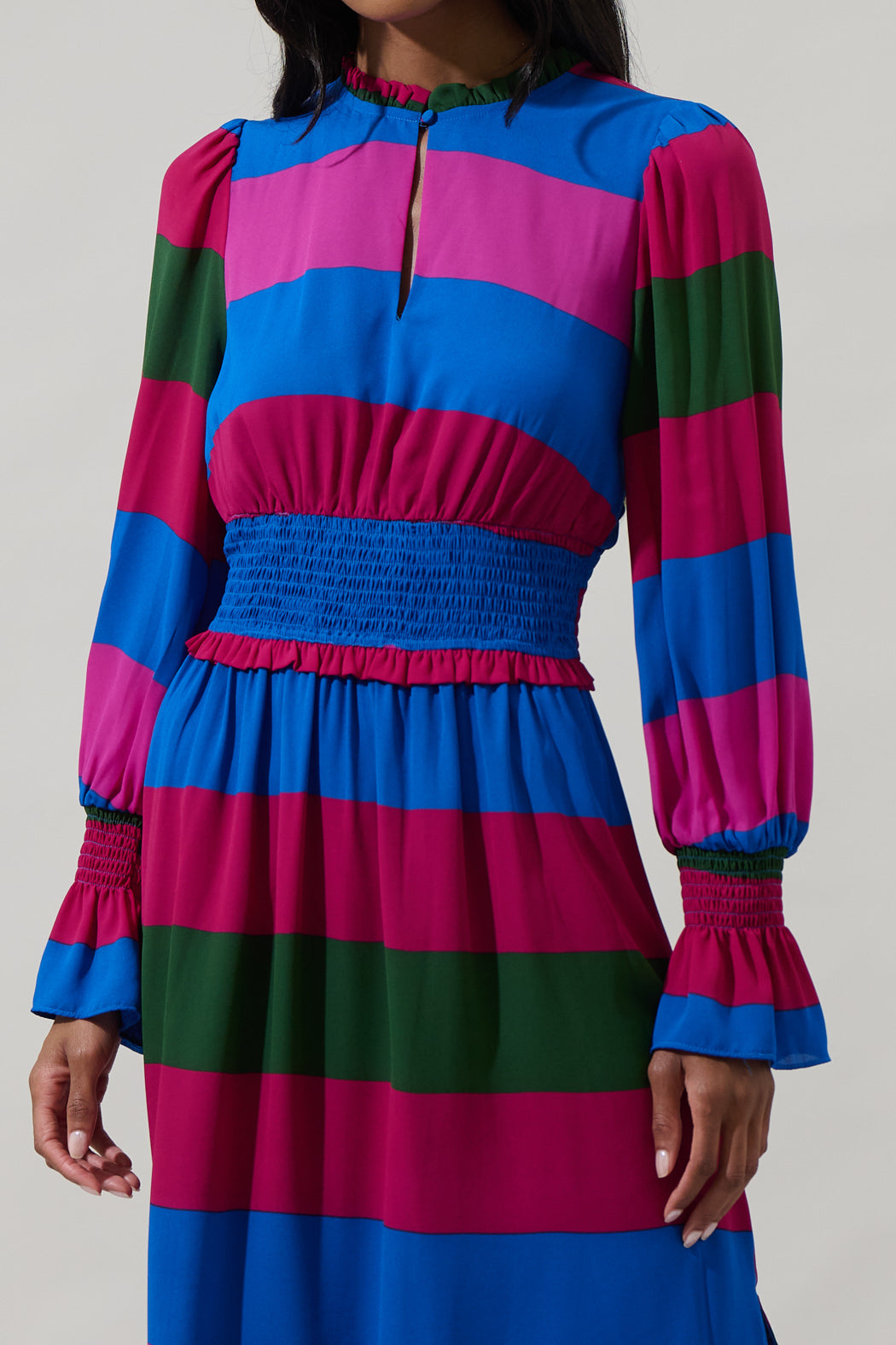 When the occasion calls for a little extra glam, slip into the Saige Striped Ria Smocked Maxi Dress. This colorful stripped pattern shapes long sleeves with smocked cuffs, and a split neckline with a button on top. The waist is smocked and the bottom is loose. Pair it up with pink heels to complete a chic look.