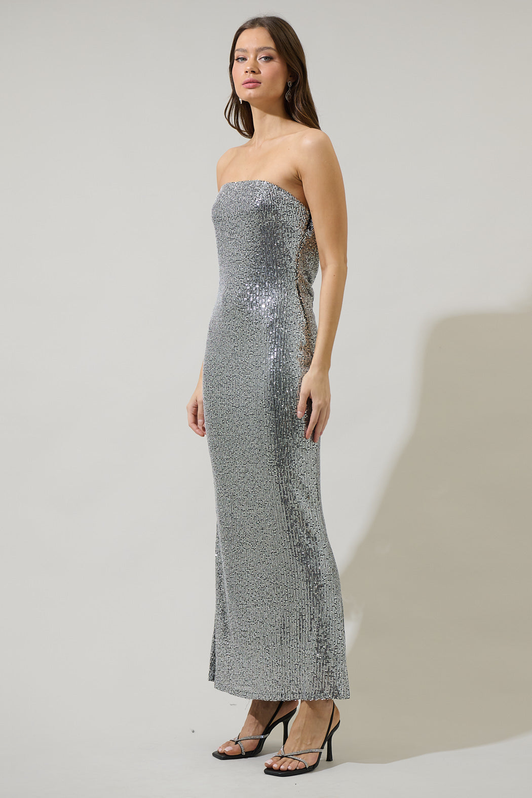 We are so lucky to have found the perfect dress for you. The Willard Sequin Dynamite Strapless Maxi Dress has gorgeous sequins all over with an open back and sleeveless arms. Wear your favorite heels and black jewelry to complete this dress.